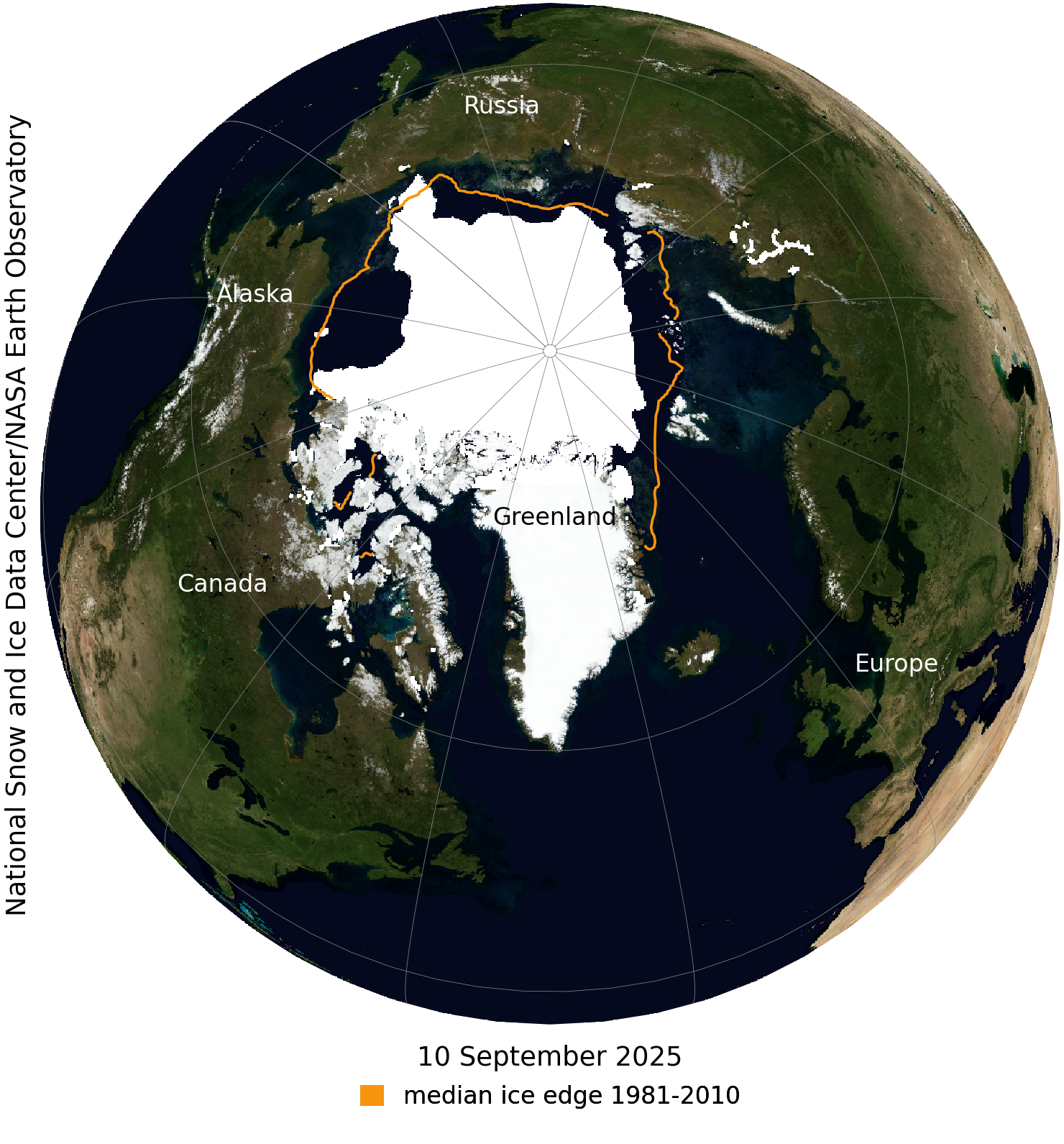 Arctic sea ice has likely reached its minimum extent for the year, at 4.60 million square kilometers (1.78 million square miles) on September 10, 2025, according to scientists at the National Snow and Ice Data Center (NSIDC) at the University of Colorado Boulder. The 2025 minimum is ranked tenth lowest in the 47-year satellite record. The last 19 years are the lowest 19 Arctic sea ice extents in the satellite record.