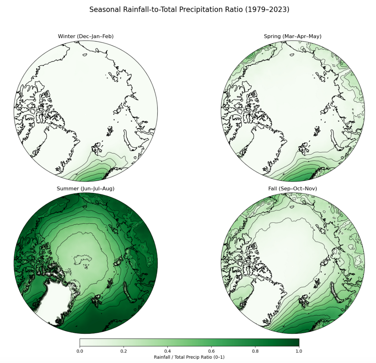 Summer has the highest proportion of liquid precipitation, but even in summer, snowfall is the rule over the Greenland Ice Sheet and is still common over parts of the Canadian Archipelago. This is the same region where Arctic sea ice remains thickest and is expected to persist longest in the coming decades.